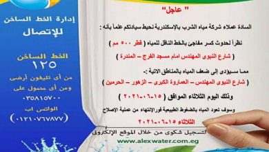 كتب / عاطف طلب أعلنت شركة مياه الشرب بالاسكندرية، عن ضعف المياه عن مناطق (شارع النبوي المهندس- العماروة الكبرى –…