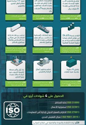 وفي مقدمة هذه الإنجازات توقيعُ وبدءُ تشغيل أكبر عقود الإسناد في تاريخ الموانئ السعودية، وذلك لتطوير وتشغيل محطتي الحاويات الشمالية والجنوبية بميناء جدة الإسلامي مع كبرى شركات التشغيل والتطوير للموانئ إقليميًا وعالميًا، بقيمة استثمارات تناهز (9) مليارات ريال، وَفْقاً لصيغة البناء والتشغيل والنقل وبعقود تمتد (30) عاماً، مما سيسهم في رفع الطاقة الاستيعابية بأكثر من (60%) لمحطات الحاويات، لتصل إلى أكثر من (13) مليون حاوية سنوياً، مقابل نحو (7.6) ملايين حاوية حالياً، وتوفير نحو (4000) وظيفة جديدة في قطاع الموانئ، بالإضافة إلى زيادة الطلب على المحتوى المحلي وزيادة تدفق الاستثمارات.