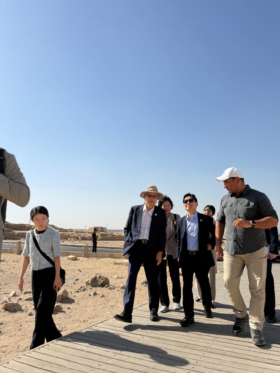 واختُتمت الزيارة بجولة في منطقة البانوراما، حيث التقط الضيف الكوري ومرافقوه صورة تذكارية أمام الخلفية المهيبة للأهرامات.