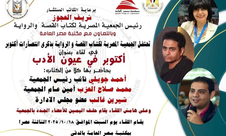 تنظم الجمعية المصرية لكتاب القصة والرواية، برعاية الكاتب المستشار شريف العجوز، رئيس الجمعية، وفي إطار احتفالات مصر بالذكرى الثانية والخمسين لانتصارات أكتوبر المجيدة، بالتعاون مع مكتبة مصر العامة بالدقي لقاء أدبيا بعنوان «أكتوبر في عيون الأدب»، وذلك في تمام الثالثة عصر يوم السبت الموافق 18 أكتوبر 2025 بمقر المكتبة بالدقي.