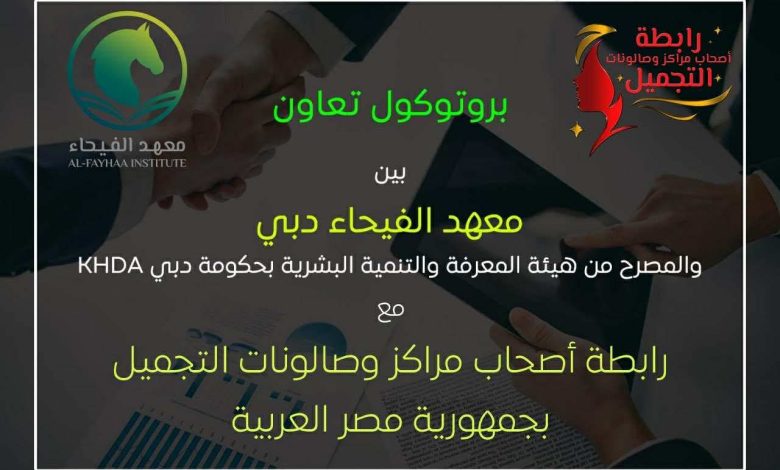 عقد معهد الفيحاء المعتمد من هيئة المعرفة والتنمية البشرية بحكومة دبي (KHDA) برتوكول تعاون مع رابطة أصحاب مراكز وصالونات التجميل وجميع العاملين في مجال الجمال، بهدف رفع كفاءة ومستوى التدريب المهني في هذا القطاع الحيوي، وذلك في إطار دعم وتأهيل الكوادر العاملة بقطاع التجميل في مصر والعالم العربي.