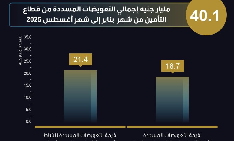 40.1 مليار جنيه إجمالي التعويضات المسددة من قطاع التأمين نهاية أغسطس 2025