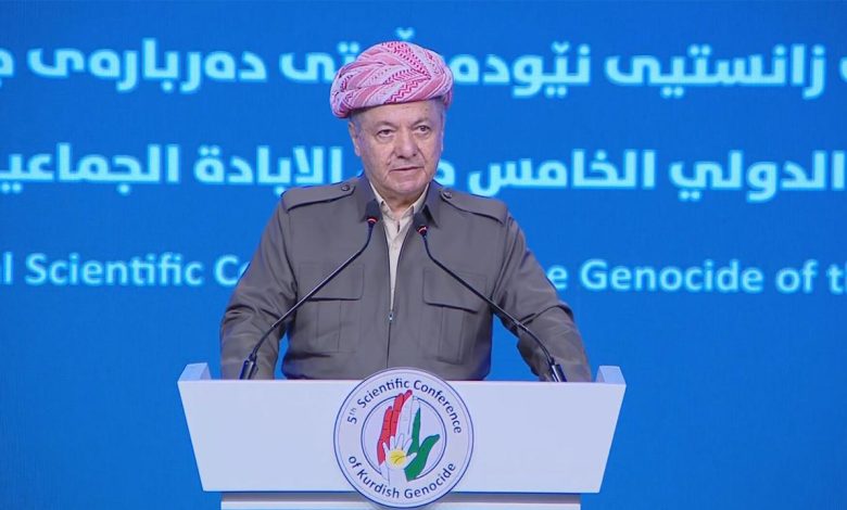 وقال مسعود بارزاني، اليوم الثلاثاء، خلال كلمة ألقاها أمام ضيوف المؤتمر الدولي الخامس للتعريف بالإبادة الجماعية، المهم المتعلق بجرائم الإبادة الجماعية في ضد الشعب الكوردي، المنعقد في محافظة دهوك، بحضور شخصيات سياسية وأكاديمية، “علمنا أن جزءاً كبيراً من الكورد الفيليين والبارزانيين قد تم نقلهم إلى مناطق عكاشات والقائم، وتم اختبار الأسلحة الكيميائية عليهم، ومنذ ذلك اليوم لم نفكر قط في الانتقام؛ وخاصة في فترة انتفاضة عام 1991، حيث وقع فيلقان من الجيش العراقي بيد المواطنين الكورد وقوات البيشمركة، وفي ذلك الوقت لم يُقتل أي جندي عراقي ولم يُهان. هؤلاء كانوا نفس الجنود الذين دمروا أكثر من 4500 قرية من قرنا، ونفذوا حملات الأنفال وارتكبوا العديد من الجرائم الأخرى ضد الشعب الكوردي”.