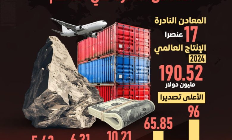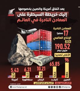 وتعد المعادن النادرة، البالغ عددها 17 عنصرًا، من أهم المواد الخام التي يعتمد عليها الاقتصاد الحديث في تصنيع الهواتف الذكية والسيارات الكهربائية والمعدات العسكرية، ووفقًا لتقارير اقتصادية، بلغ حجم الإنتاج العالمي من هذه المعادن نحو 190.52 مليون دولار في عام 2024، تتصدره الصين بإنتاج يقدر بنحو 96 مليون دولار تمثل أكثر من نصف السوق العالمية، بحسب ماعت جروب ، لتظل بكين اللاعب الأبرز في هذا القطاع الاستراتيجي، مستفيدة من هيمنتها على عمليات التكرير والتصنيع التي تمنحها نفوذًا واسعًا في الأسواق الدولية.