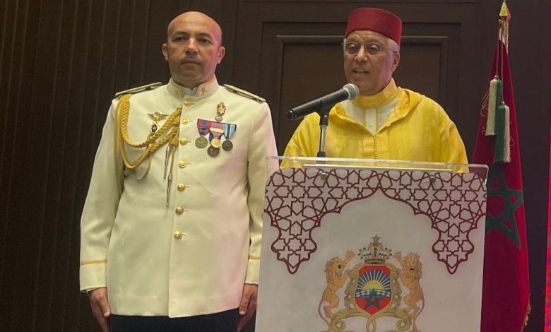 وفذ ختام كلمته قال السفير : لا يفوتني أن أستحضر، وأن نستحضر جميعاً، بإجلال وتقدير، روح مبدع المسيرة الخضراء، المغفور له جلالة الملك الحسن الثاني، طيب الله. ثراه، ونشيد عالياً بالجهود والتضحيات التي تبذلها القوات المسلحة الملكية، والقوات الأمنية بمختلف أنواعها، وكل القوى الحية، داخل الوطن وخارجه، في الدفاع عن وحدة بلادنا والحقوق المشروعة لوطننا الغالي” .