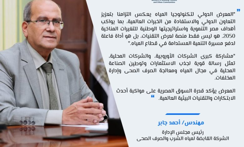 وفي هذا السياق، أكد المهندس أحمد جابر شحاتة، القائم بأعمال رئيس مجلس إدارة الشركة القابضة لمياه الشرب والصرف الصحي، أن الدورة الرابعة من المؤتمر والمعرض تأتي لتعزيز موقع مصر كمنصة إقليمية رائدة في مجال تقنيات المياه والتحلية، موضحًا أن الحدث يمثل فرصة مهمة لتجميع الخبرات العالمية وتبادل الرؤى حول مستقبل إدارة الموارد المائية، ويمثل نقطة التقاء استراتيجية بين المؤسسات الصناعية والبحثية وشركات التكنولوجيا المتقدمة.