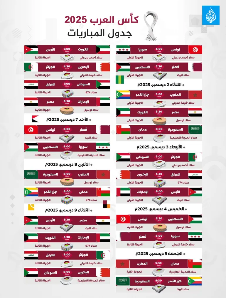 نستعرض جدول مباريات بطولة كأس العرب 2025 لكرة القدم، التي ستنطلق في الأول من ديسمبر/كانون الأول المقبل بالعاصمة القطرية الدوحة.