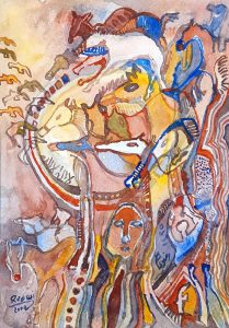في أعماله التي مثلت مرحلة ثانية في تجربته الفنية وقد برزت الدائرة، انطلق رضوي من مفردة الحصان الذي ربما رأى فيه عنصرا يرمز للأصالة فنوع على حركته منطلقا من نقطة في الوسط ومنتهيا إلى أطراف العمل بحركة لولبية رأى فيها دينامية الحياة إلا أن عناصره التالية أخذت في التنوع وظهر في لوحته المنزل والأشخاص والحركة اليومية الشعبية، ومع التواصل في هذا التوجه أخذت الحركة تقل وتتوارى لصالح وضوح العناصر الجديدة التي أخذت تؤكد اتجاهه الفني الذي حافظ عليه إلى آخر أعماله المعروفة.