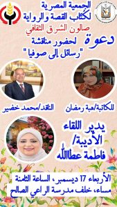 تنظم لجنة مدن القناة وسيناء بالجمعية، برئاسة الأديبة منى الجبريني، وبالتعاون مع صالون الشرق الثقافي ببورسعيد برئاسة نجيب سليمان، ندوة أدبية لمناقشة كتاب «رسائل إلى صوفيا» للكاتبة هبة رمضان، وذلك تحت رعاية الكاتب المستشار شريف العجوز، رئيس الجمعية المصرية لكتاب القصة والرواية.