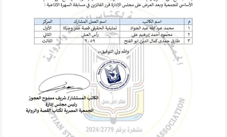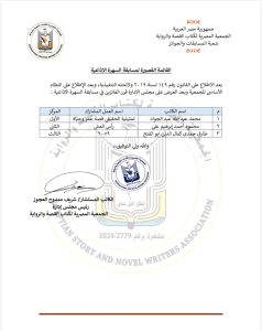 أعلنت الجمعية المصرية لكُتاب القصة والرواية، عن نتائج مسابقة السهرة الإذاعية لعام 2025، وذلك عقب العرض على مجلس إدارة الجمعية واعتماد قرارات لجنة التحكيم، وتصديق الكاتب المستشار شريف العجوز رئيس الجمعية.