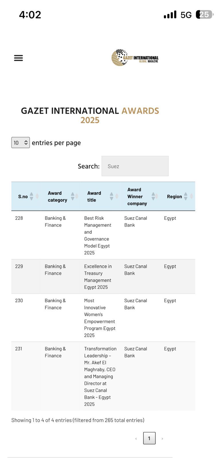 بنك قناة السويس يحصد 4 جوائز دولية مرموقة من “Gazet International” لعام 2025