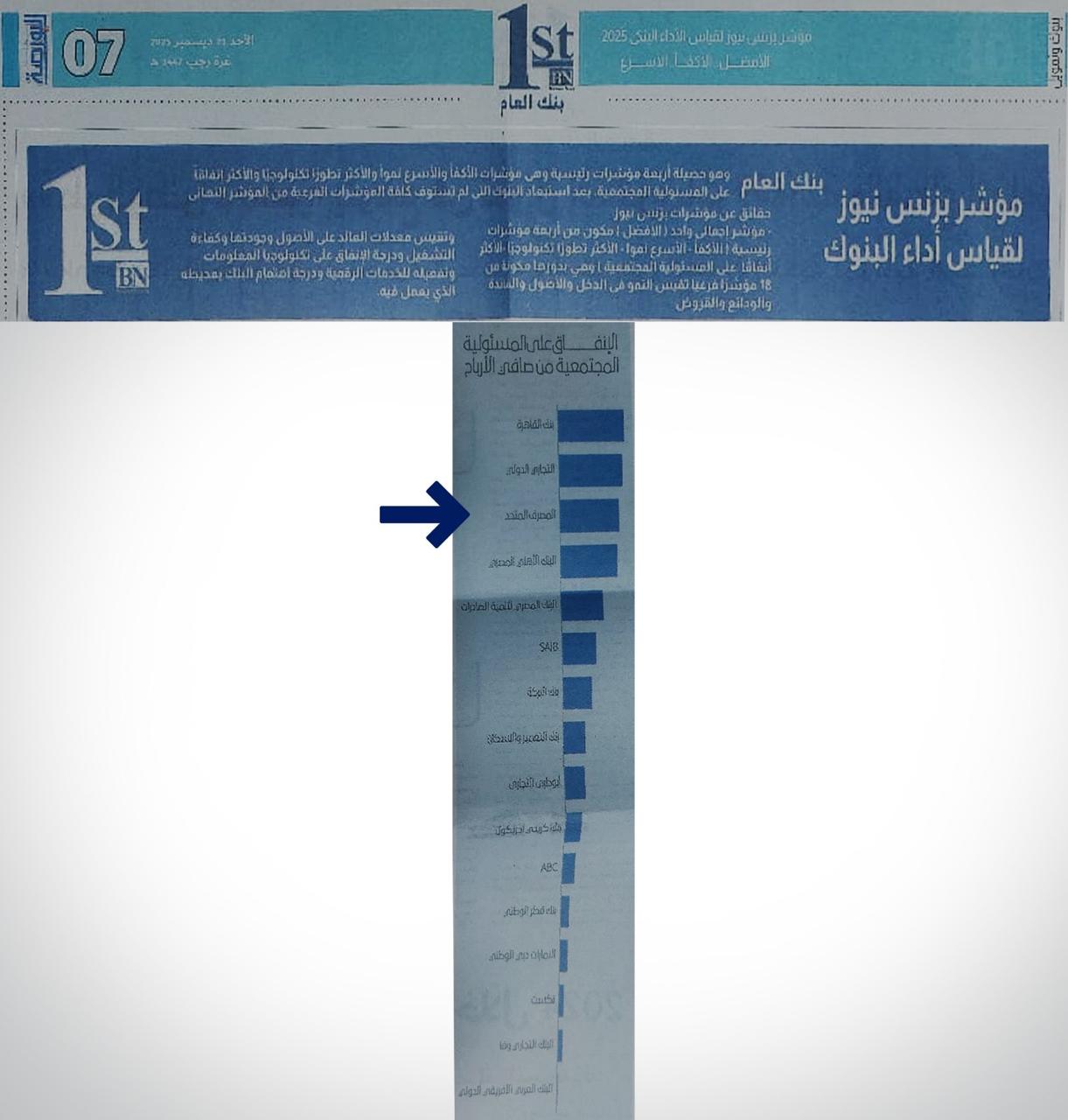 تصدر المصرف المتحد مؤشرات بيزنس نيوز 2025 السنوي لأعمال المسئولية المجتمعية والالتزام بأهداف التنمية المستدامة والدعم المجتمعي. وذلك من حيث معدل الانفاق السنوي على أعمال التنمية المجتمعية.