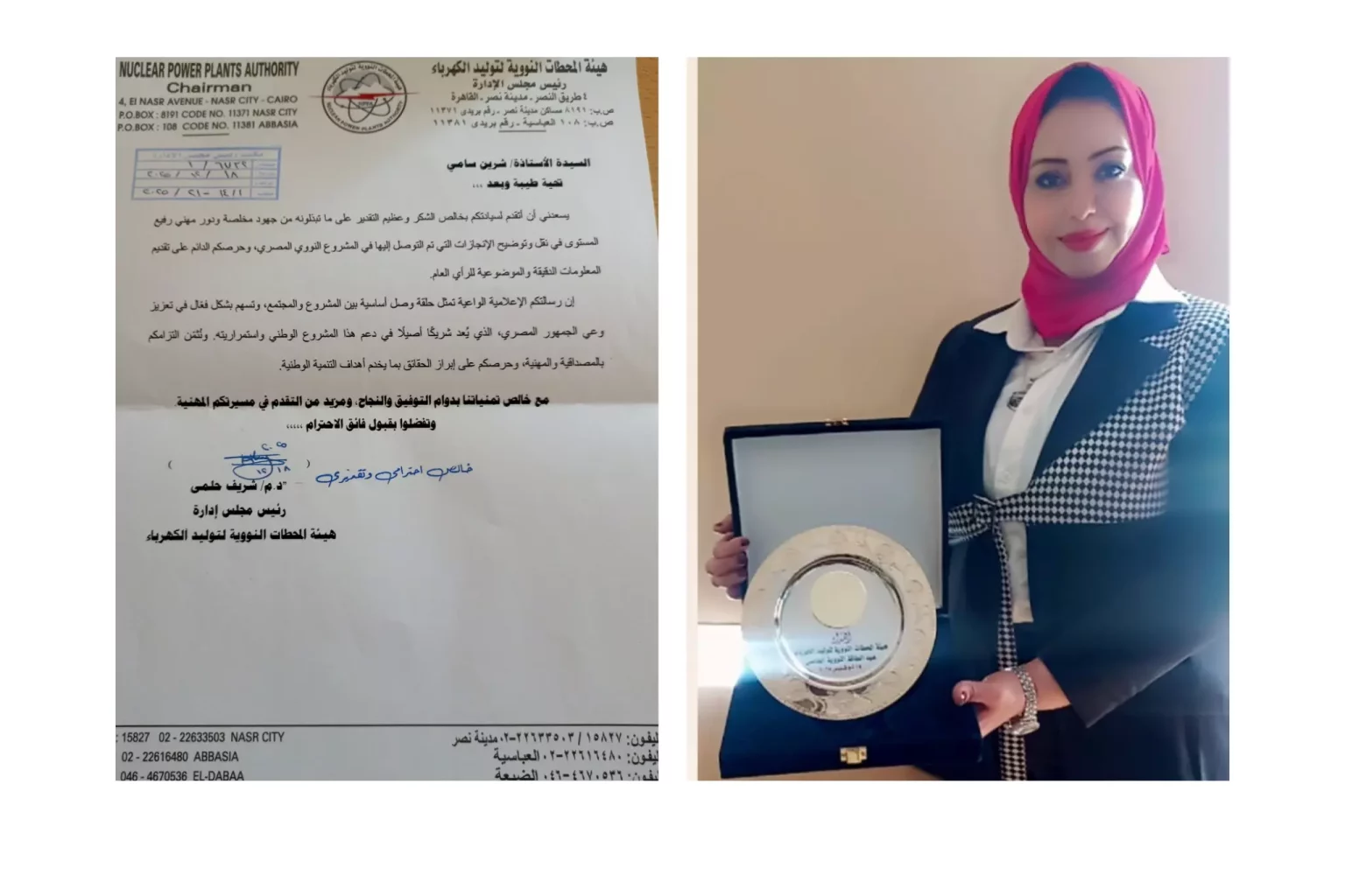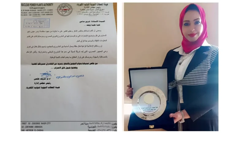 في عيد الطاقة النووية الخامس.. تكريم الكاتبة الصحفية “شيرين سامي” بدرع هيئة المحطات النووية