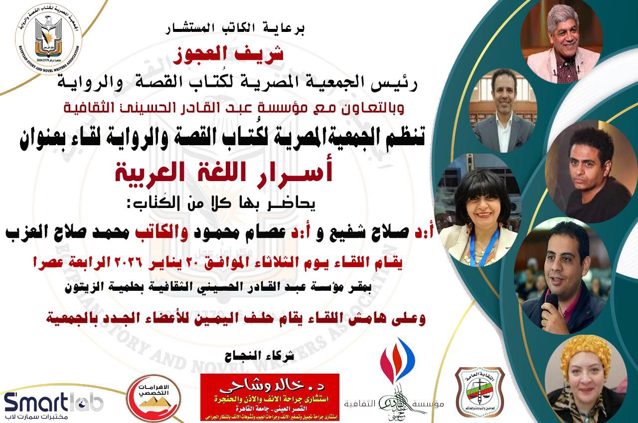 تنظم الجمعية المصرية لكُتاب القصة والرواية لقاءً أدبيًا وفكريًا متميزًا بعنوان «أسرار اللغة العربية»، وذلك في إطار أنشطتها الهادفة إلى تعميق الوعي بقيمة اللغة العربية ودورها المحوري في الإبداع الأدبي والفكري، تحت رعاية الكاتب والمستشار شريف العجوز رئيس الجمعية المصرية لكتاب القصة والرواية، وبالتعاون مع مؤسسة عبدالقادر الحسيني الثقافية.