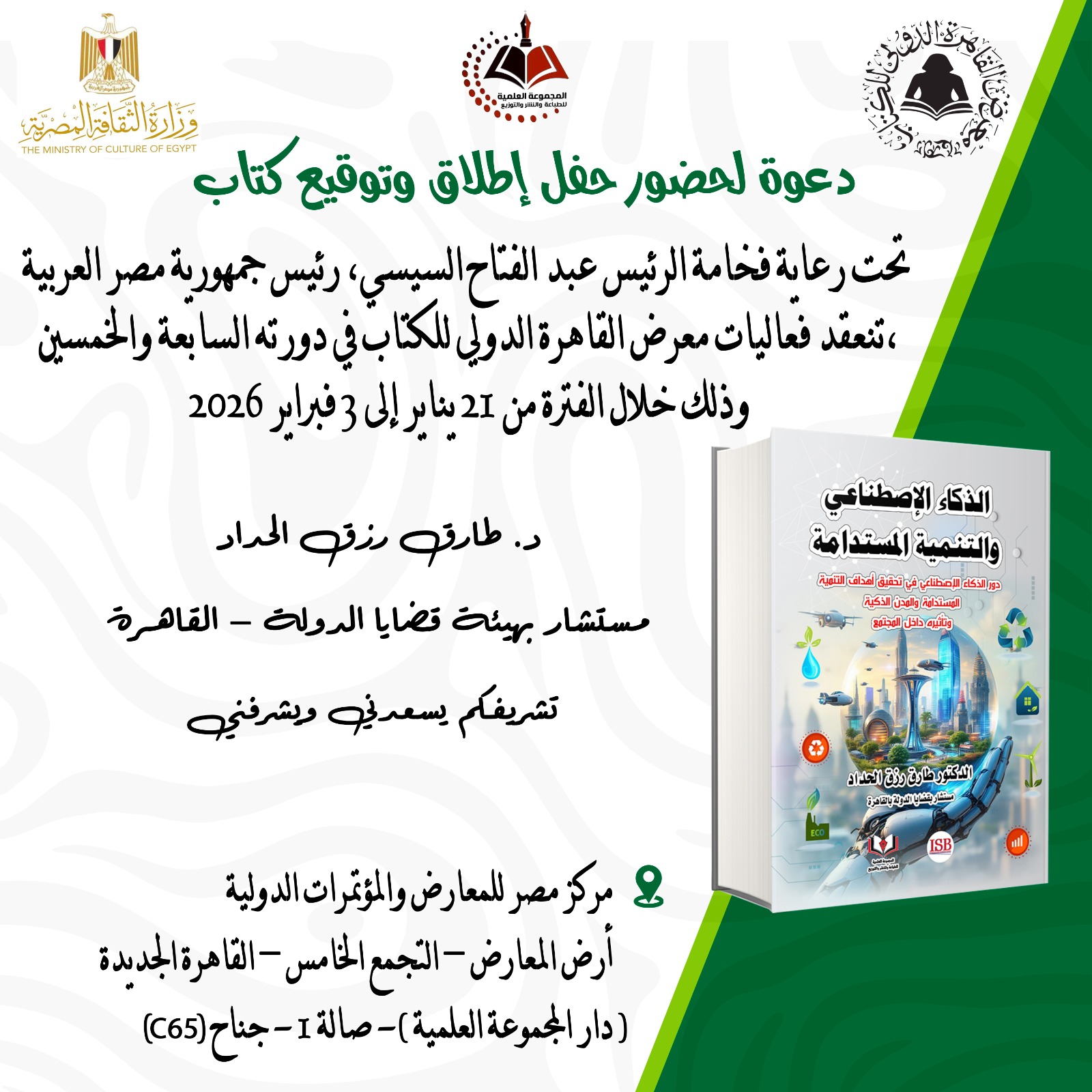 المستشار الدكتور طارق رزق الحداد يشارك في معرض القاهرة الدولي للكتاب بكتاب “الذكاء الاصطناعي والتنمية المستدامة”