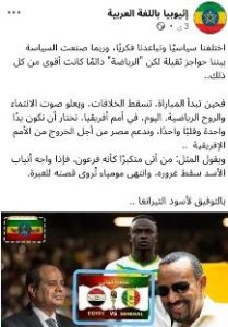 وظهر التآمر الإثيوبي على مباراة مصر، والسنغال في صفحة إثيوبيا تتحدث بالعربي على فيس بوك عندما دعت الصفحة إلى هزيمة منتخب مصر على يد أسود السنغال، وتشبيه مصر بالمومياء الميتة، وهو ما ترغب فيه إثيوبيا حقيقة الأمر في تلك الأجواء التي اختلطت بها السياسة بالكرة، وذلك قبل المبارة لإحباط المصريين.
