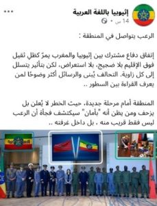 واللافت في أمر المغرب تحالفها العسكري مع إسرائيل الذي وقعته منذ سنوات من أجل الاستقواء بإسرائيل في مواجهة الجزائر بقضية نزاع الصحراء الغربية، لكن تطور المغرب بالدفاع عن إثيوبيا بتلك الفترة الدقيقة من تاريخ الأمة العربية، واسقاط الدول العربية التي تساقطت مثل قطع الدومينو منذ عام 2011 حتى الآن، ولم يتبقى في المنطقة العربية سوى الشعب المصري، والجيش المصري، وتكمن المؤامرة الصهيونية في تدمير جميع دول المواجهة مع إسرائيل، وتكون مصر، والمملكة العربية السعودية، والأردن من دول المواجهة التي لا تزال تمتلك جيوش قوية يمكنها مواجهة إسرائيل.