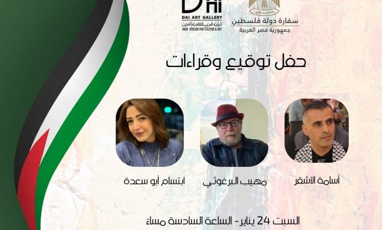 ويشهد صالون ضي، بالزمالك، اليوم السبت 24 يناير، حفل توقيع وقراءات للكتاب أسامة الأشقر ومهيب البرغوثي وابتسام أبو سعدة، والخميس 29 يناير توقيع وقراءات فاتنة الغرة وماهر المقوسي ووفاء داري.