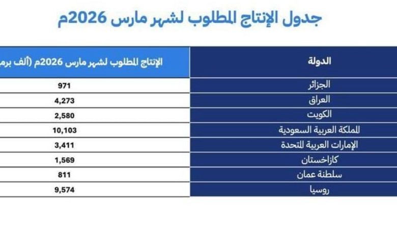 وجددت الدول الثماني المشاركة التأكيد على قرارهافي 2 نوفمبر 2025م، بتعليق الزيادات في الإنتاجخلال شهر مارس من عام 2026م، نظرًا للعواملالموسمية، كما هو موضح في الجدول أدناه.