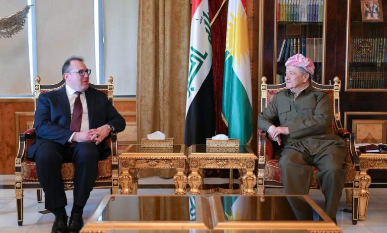 استقبل الزعيم الكردي مسعود بارزاني، اليوم الأربعاء، في بیرمام، القائم بأعمال السفارة الأمريكية لدى العراق، جوشوا هاريس.
