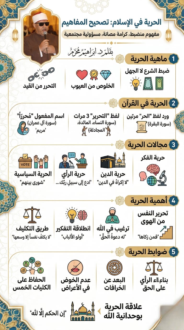 إن جوهر الحرية في الإسلام يتلخص في “الأمن”؛ فالمؤمن الحق لا يخشى في الله لومة لائم، ويمتلك شجاعة “إبراهيم الخليل” في تفنيد الباطل بالحجة والمنطق وسرعة البديهة.