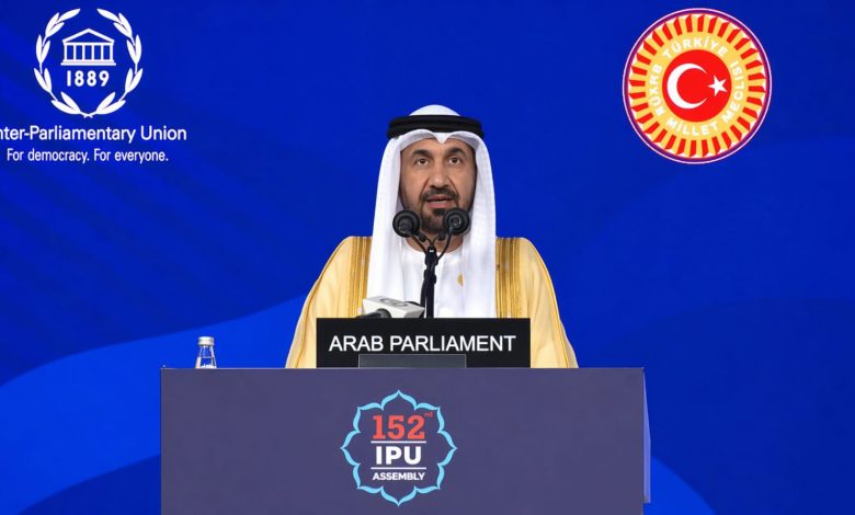 جاء ذلك في كلمته الرئيسية التي ألقاها باسم البرلمان العربي أمام الجمعية العامة الـ 152 للاتحاد البرلماني الدولي المنعقدة في مدينة إسطنبول التركية،