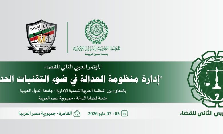 تعقد المنظمة العربية للتنمية الإدارية – جامعة الدول العربية، المؤتمر العربي الثاني للقضاء تحت عنوان: إدارة منظومة العدالة في ضوء التقنيات الحديثة” بالتعاون مع هيئة قضايا الدولة – جمهورية مصر العربية، خلال الفترة من 5-7 مايو المقبل، بالقاهرة، وذلك استمراراً لمسيرة التعاون بينهما، وتفعيلا لتوصيات المؤتمر في نسخته الأولى التي عقدت عام 2025، وبحضور ومشاركة نخبة من أصحاب كبار المسئولين والخبراء بالهيئات والجهات والأجهزة القضائية العربية.