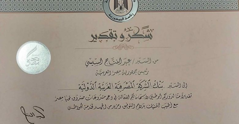 بنك saib» يحصد شهادة تقدير من «رئيس الجمهورية» لدعمه صندوق تحيا مصر