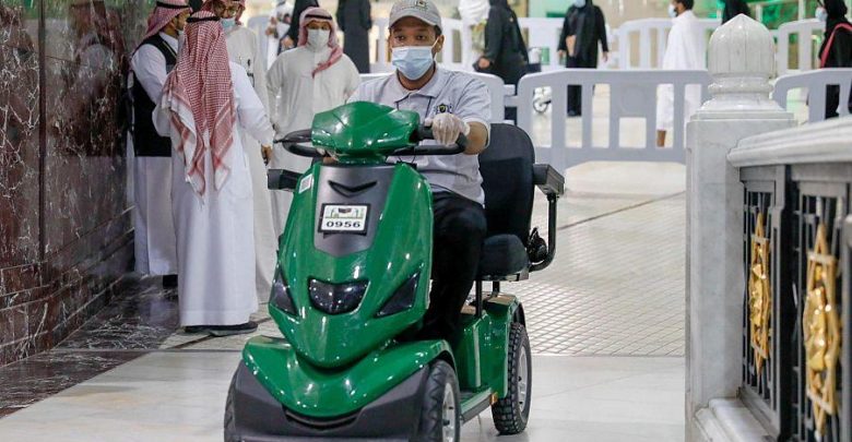 ورفعت إدارة خدمات التنقل كامل جاهزيتها لخدمة زوار البيت العتيق بتجهز أكثر من (٥٠٠٠) عربة عادية وقرابة (٣٠٠٠) عربة كهربائية لمحتاجيها من المعتمرين وقاصدي المسجد الحرام، لتسهيل عملية تنقل المصلين والمعتمرين من خلال دور الميزانين بالدور الأول للطواف والسعي بالعربات، التي يمكن الوصول إليها من أربعة مداخل للمسجد الحرام وهي: (مدخل “الشبيكة” عبر جسر الشبيكة, وسلم “الأرقم”، و”المروة” فوق سطح دورات القشاشية)، مع وضع ملصقات في مواقع التوزيع تؤكد على تطبيق التباعد الاجتماعي، وعدم التزاحم، عند طلب الخدمة، وملصقات على العربات تؤكد خضوع العربات للتعقيم قبل الاستخدام وبعده.