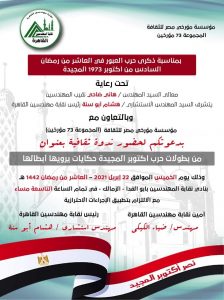 تنظم نقابة المهندسين بالقاهرة برئاسة المهندس الاستشاري هشام ابوسنة وبالتعاون مع مؤسسة مؤرخي مصر للثقافة (المجموعة 73 مؤرخين ) ندوة ثقافية بعنوان ” من بطولات حرب أكتوبر المجيدة حكايات يرويها أبطالها ” الساعة التاسعة مساء الخميس 22 ابريل 2021 بنادي نقابة المندسين بأبو الفدا – الزمالك.
