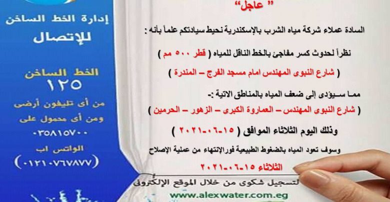 هذا وقد قامت الشركة بتدبير سيارات مياه صالحة للشرب متواجدة بالمناطق المتأثرة وفى حالة طلبها يرجى الاتصال بالخط الساخن ( 125 ) ومن اي محمول ( 035815700) الواتس اب ( 01210767877)