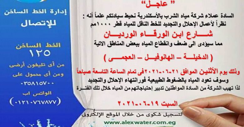 أعلنت شركة مياه الشرب بالاسكندرية،عن ضعف وانقطاع المياه عن مناطق (الدخيلة – العجمي – الهانوفيل) وذلك اعتبارا من يوم الاثنين الموافق 21/6/2021 في تمام الساعة التاسعة صباحا نظراً لقيامها بأعمال الاحلال والتجديد للخط الناقل للمياه قطر 1000 مم بشارع ابن الورقاء- الورديان.
