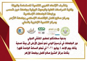 أقام الإتحاد العربي للتنمية المستدامة والبيئة ورابطة الجامعات الإسلامية بالتعاون مع كلية الدراسات العليا والبحوث البيئية بجامعة عين شمس ومركز التنمية الإدارية بالدقي، الملتقى الدولي بعنوان: (دور الجامعات في ترسيخ الوعي البيئي نحو تحول الأراضي إلى بيئة صحية)، بالقاعة الكبرى بمركز صالح كامل للاقتصاد الإسلامي بجامعة الأزهر، أمس الأحد.