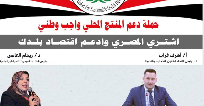 طرح أشرف غراب نائب رئيس الاتحاد العربي للتنمية الاجتماعية بمنظومة العمل العربي بجامعة الدول العربية لشؤون التخطيط والتنمية الاقتصادية،برئاسة الدكتورة ريهام العاصي، مبادرة وحملة موسعة لدعم المنتج المحلي والاقتصاد الوطني بعنوان “دعم المنتج المحلي واجب وطني..اشتري المصري”، تهدف إلى تشجيع المواطنين على شراء المنتج المحلي الذي تنتجه المصانع المصرية وتفضيله على المنتجات المستوردة .