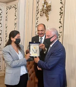 وفي نهاية اللقاء ، قدم اللواء خالد فودة ، درعَ المحافظة ، السيدة فريدة خميس ، تقديراً لجهودها الكبيرة ، في دعم ورعاية أبناء جنوب سيناء .