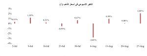 ارتفعت أسعار النفط بنسبة 11.54% خلال الأسبوع، وهو أعلى مستوى منذ يونيو 2020 حيث بدأت شركات الطاقة في إغلاق الإنتاج الأمريكي في خليج المكسيك قبل إعصار كبير من المتوقع أن يضرب المنطقة هذا الأسبوع. أغلق منتجو النفط يوم الجمعة 59% من إنتاج النفط الخام بخليج المكسيك مع اقتراب العاصفة من حقول النفط البحرية الأمريكية الرئيسية، وذلك وفقًا لمكتب السلامة وإنفاذ البيئة (BSEE). كما تلقت أسعار النفط دعما من انخفاض الدولار الأمريكي إلى أدنى مستوى له في أسبوع واحد بعد تصريحات رئيس مجلس الاحتياطي الفيدرالي الأمريكي جيروم باول. وفي الفترة القادمة، ستجتمع أوبك + في الأول من سبتمبر لمناقشة خطتها التي بدأتها في يوليو لزيادة الإنتاج بمقدار 400 ألف برميل يوميًا لكل شهر، وذلك للأشهر العديدة القادمة.