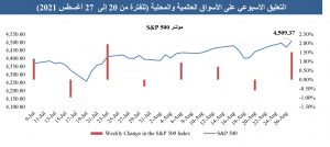 أنهت الأسهم الأمريكية تداولات هذا الأسبوع على ارتفاع، محققة بذلك مستويات قياسية جديدة. ففي بداية هذا الأسبوع، تراجع قلق المستثمرين حيال بدء الاحتياطي الفيدرالي في تغيير موقفه الحالي الذي يميل إلى تيسير السياسة النقدية. وفي منتصف الأسبوع، دفعت الأرباح الفصلية القوية في الربع الثاني والتي أعلنت عنها بعض الشركات الكبرى بالأسواق الى الصعود. وأخيرًا في نهاية الأسبوع، سجلت الأسهم مستويات قياسية جديدة حيث اعتبرت الأسواق أن تصريحات باول تميل إلى الابقاء علي سياسة نقدية تيسيريه بشكل أكثر مما كان متوقعا . وحقق مؤشرا ستاندرد آند بورز S&P 500 وناسداك المركب Nasdaq مستويات قياسية جديدة، حيث ارتفعا بنسبة 1.52% و2.8% على التوالي. وكانت أسٍهم صناعة السيارات والسفر تمثلان القطاعان الأفضل أداء ضمن مؤشر ستاندرد آد بورز. علاوة على ذلك، ارتفع مؤشر داو جونز الصناعي Dow Jones index بنسبة 0.69%، لينهى تداولات هذا الأسبوع منخفضًا عن مستواه القياسي البالغ 35,625.4 نقطة، والذي سجله في 16 أغسطس. وفي أوروبا، حققت الأسهم أيضًا مكاسب، حيث ارتفع مؤشر STOXX 600 بنسبة 0.76% على خلفية اللهجة التيسيرية لرئيس الاحتياطي الفيدرالي في ندوة جاكسون هول .