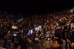 لم تكن حفلة سلطان الطرب الذي حافظ على جماهيرته الواسعة طوال مسيرته الفنية التي امتدت لاكثر من 40 عام، عادية، فمدرحات المسرح غصت بالحضور الذي فاق تعداه ٦ آلاف شخص، لتذكرنا بحفله الأخير في جرش عام 2003، في حين ارتدى عشّاقه القمصان التي تحمل صورته، حاملين لافتات كبيرة لصورته متوّجة بعبارة “دبنا عَ غيابك دبنا”.