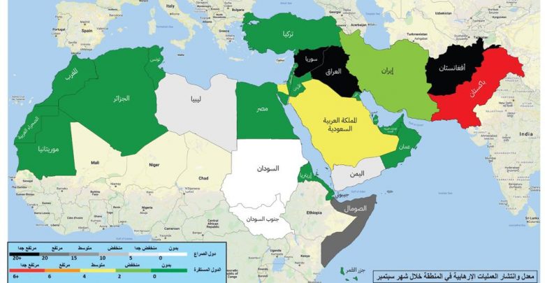 كشف الرصد الذي أجراه “المركز الوطني للدراسات” للأنشطة والتفاعلات المرتبطة بالظاهرة الإرهابية في نطاق دول الشرق الأوسط والمنطقة العربية خلال شهر سبتمبر عن وقوع نحو 140 هجمة إرهابية، وذلك بعد استبعاد كافة العمليات القتالية التي نفذتها التنظيمات الإرهابية داخل بعض دول المنطقة في إطار الصراعات الدائرة مع غيرها من التنظيمات المسلحة غير الشرعية، وقد أشار المركز، في عدده الجديد الصادر اليوم، إلى وقوع نحو 126 هجمة إرهابية في نطاق دول المنطقة التي تشهد صراعات أو عدم استقرار سياسي؛ بنسبة 90% من إجمالي عدد الهجمات، بينما أشار إلى وقوع 14 هجمة إرهابية في الدول التي يصفها التقرير بالمستقرة؛ وذلك بنسبة 10% من إجمالي الهجمات ذاتها.