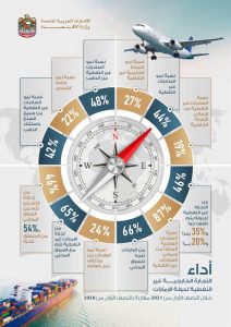 ووفقاً للبيانات الرسمية الأولية، سجلت التجارة الخارجية غير النفطية للدولة ما يقدر بنحو 900 مليار درهم في النصف الأول من عام 2021. وزادت الصادرات غير النفطية للدولة في الفترة ذاتها إلى 170 مليار درهم، محققةً نمواً بنسبة 44% مقارنة مع النصف الأول من 2020، وبزيادة نسبتها 41% مقارنة مع الفترة ذاتها من 2019.