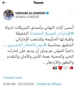 وقال الجودر، في تغريدة له على موقع التواصل الاجتماعي تويتر: “أسمىآيات التهاني وأصدق التبريكات لدولة #الإماراتالعربيةالمتحدة الشقيقة ولقيادتها الحكيمة وللشعب الإماراتي الشقيق بمناسبة #عيدالاتحادالخمسين.. داعيًا المولى عزوجل أن يديم على إمارات الخير والمحبة نعمة الأمن والأمان والتقدم والتطور والازدهار”.