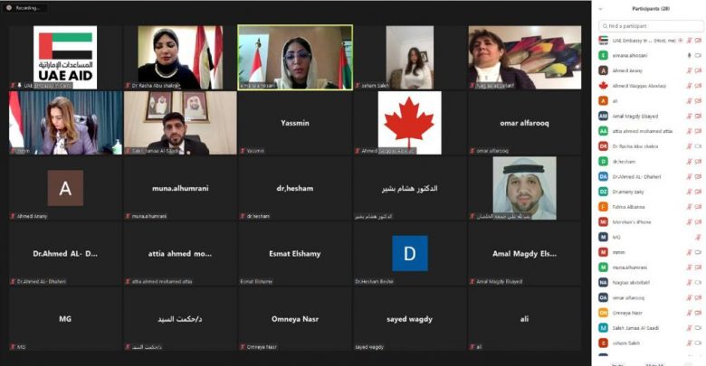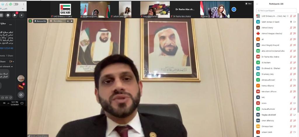 نظمت سفارة دولة الإمارات العربية المتحدة لدي مصر ظهر اليوم الأربعاء ندوة بعنوان ” تمكين المرأة وحماية النساء والفتيات في الإمارات ومصر ” وذلك عبر” زووم”، وحضر الندوة الدكتورة منال عوض محافظ دمياط ، والدكتورة رشا أبو شقرة عضو مجلس النواب، والمستشارة نجلاء عبداللطيف نائب رئيس هيئة النيابة الإدارية،والإعلامية سهام صالح وكيل أول نقابة الإعلاميين، والاستاذه إيمان الحوسني، الملحق الفني بملحقية التعليم وعلوم التكنولوجيا، والمستشار صالح السعدي رئيس قسم الشؤون الإعلامية والدبلوماسية العامة .
