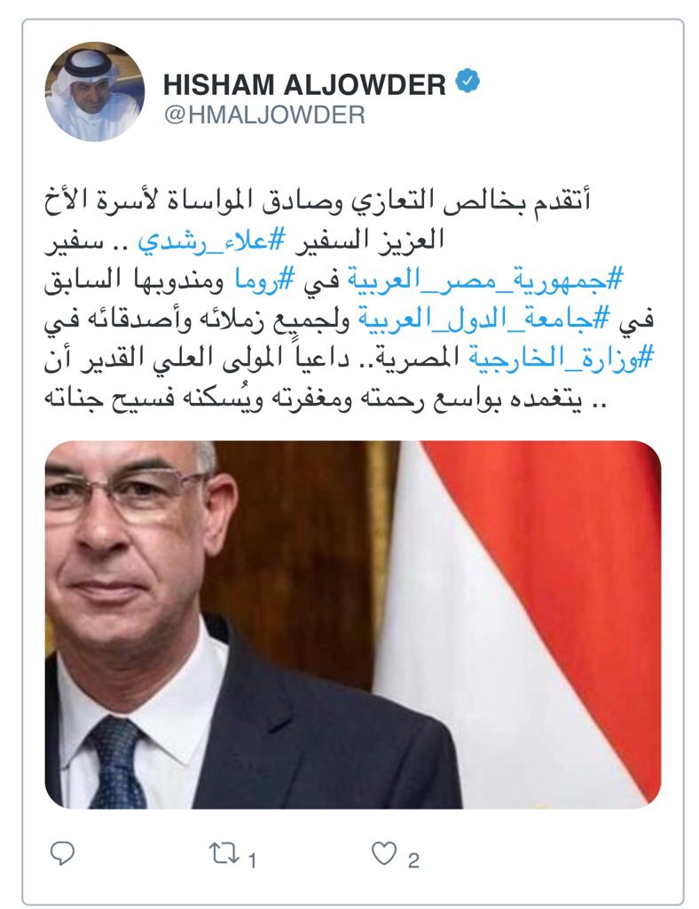 وكتب السفير الجودر في تغريدة له على صفحته بموقع التواصل الاجتماعي “تويتر”: “أتقدم بخالص التعازي وصادق المواساة لأسرة الأخ العزيز #علاءرشدي .. سفير #جمهوريةمصرالعربية في #روما ومندوبها السابق في #جامعةالدولالعربية ولجميع زملائه وأصدقائه في #وزارةالخارجية المصرية.. داعيًا المولى العلي القدير أن يتغمده بواسع رحمته ومغفرته ويسكنه فسيح جناته”.