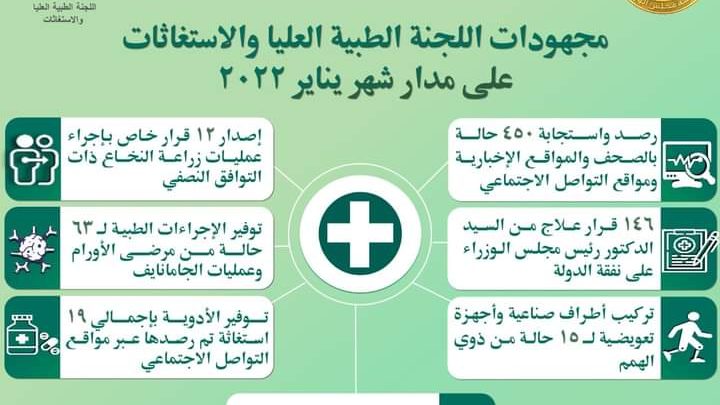 رئيس الوزراء يتابع الجهود المبذولة من “اللجنة الطبية العليا والاستغاثات ” بمجلس الوزراء خلال يناير الماضى