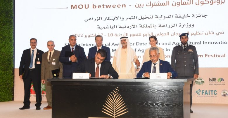 كما تم توقيع بروتوكول تعاون مع وزارة الزراعة في المملكة الأردنية الهاشمية في شأن تنظيم المهرجان الدولي الرابع للتمور الأردنية في أكتوبر 2022، وبروتوكول تعاون مع وزارة التنمية الريفية في الجمهورية الإسلامية الموريتانية في شأن تنظيم المهرجان الدولي الأول للتمور الموريتانية بديسمبر 2022، وبروتوكول تعاون مع الوكالة الوطنية لتنمية مناطق الواحات وشجر الأركان بالمملكة المغربية، في شأن المبادرة الدولية للمحافظة على واحات النخيل لمواجهة التغير المناخي، وبروتوكول تعاون شركة (Plant Arc Bio) المتخصصة بالزراعة العضوية من دولة إسرائيل، وخطاب نوايا مع كلية الزراعة في الجامعة الأردنية بشأن تبادل ونشر المعلومات حول الأمن الغذائي والتغذية والتنمية الزراعية، ومذكرة تفاهم مع جمعية تنمية وتطوير الصادرات البستانية (هيا) بجمهورية مصر العربية في شأن تنظيم المؤتمر الدولي الأول لمنتجي ومصدري التمور بالعالم العربي 2023، ومذكرة تفاهم بين جمعية تنمية وتطوير الصادرات البستانية (هيا) وجمعية التمور الأردنية، في شأن التعاون المشترك في مجال إنتاج محصول النخيل والتمور، ومذكرة تفاهم مع شركة كابيتال للفعاليات التابعة لمركز أبوظبي الوطني للمعارض (أدنيك) في شأن تنظيم معرض ابوظبي الدولي للتمور بنسخته السابعة بأبوظبي في ديسمبر 2022، والمهرجان الدولي العاشر لنخيل التمر بالإمارات بالعين في نوفمبر 2022، وخطاب نوايا بين الجائزة والمنظمة العربية للتربية والثقافة والعلوم (الالسكو) في شأن تنمية المعرفة المتخصصة بنخيل التمر والابتكار الزراعي.