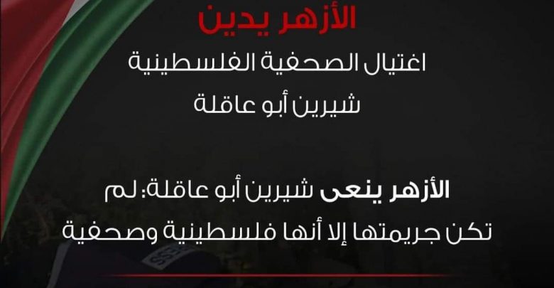 ويؤكد الأزهر أنَّ هذه الجريمة بحق الصحافة والصحفيين تبرهن بقوة أمام العالم بشاعة هذا الكيان الغاشم وما يقوم به من إرهابٍ وجرائمَ حتى بحق صحفية لم تحمل سلاحًا ولم تقتل ولم تضرب ولم تكن جريمتها إلا أنَّها فلسطينية وأنَّها صحفية تنقل الصورة والحدث وتوصل صوت المظلومين والمضطهدين في أرضهم إلى العالم وبسبب هذا تواجه الخوف والموت طَوال الوقت.