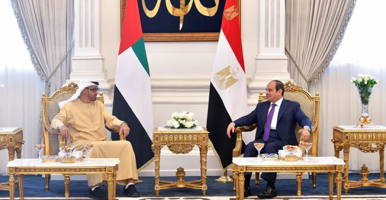 وفي وقت سابق الأحد، وصل رئيس دولة الإمارات، الشيخ محمد بن زايد آل نهيان، إلى مدينة العلمين المصرية، حيث بحث مع نظيره المصري “تعزيز العلاقات الثنائية بين البلدين، وتبادل الرؤى ووجهات النظر تجاه القضايا الدولية والأمن الإقليمي، والأوضاع الراهنة بالمنطقة العربية”.