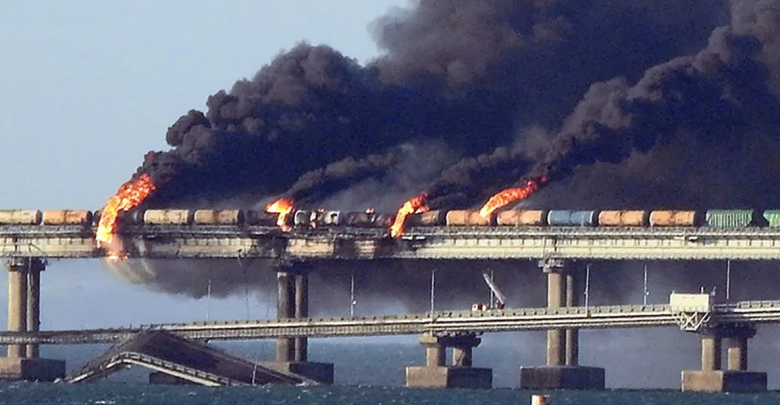 أفادت الخدمة الصحفية لسكة حديد القرم أنه في الساعة 06:05 تم تفجير شاحنة على جسر “كيرتش”، ما أدى إلى اشتعال النيران في عدد من صهاريج الوقود في قطار كان يسير عبر الجسر.