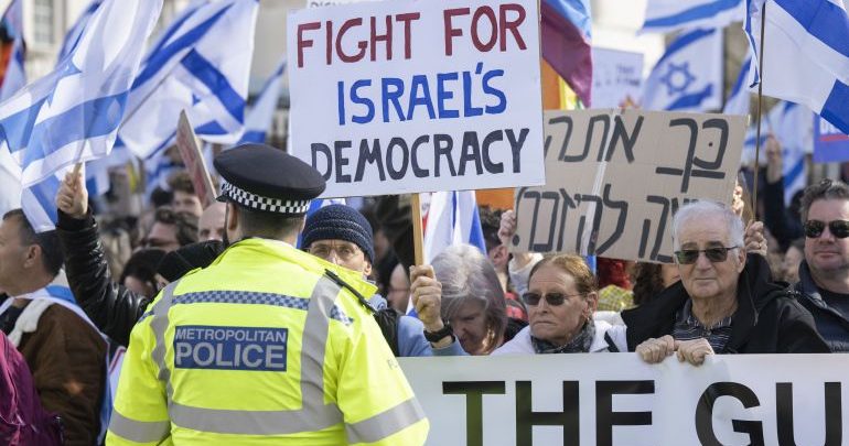 أعلن ضباط وجنود احتياط إسرائيليون رفضهم أداء الخدمة العسكرية احتجاجا على مضي حكومة رئيس الوزراء بنيامين نتنياهو في قانون الإصلاح القضائي، وفي الأثناء تظاهر إسرائيليون ضد نتنياهو أمام مقر الحكومة البريطانية بالتزامن مع محادثات يجريها في لندن.