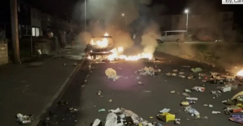 أضرمت النار في سيارتين على الأقل وتعرضت قوات الشرطة للرشق بالحجارة بعد حادث مروري ليل الاثنين في كارديف عاصمة ويلز، تحول إلى ما وصفه المسؤولون بـ”الفوضى على نطاق واسع”.